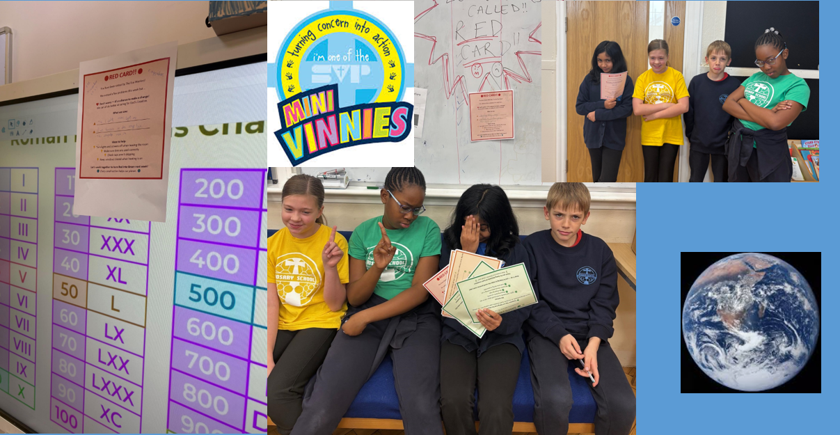 This week the Mini Vinnies Eco Warriors have started their CALLING CARD VISITS! Each week, they will make surprise visits to classrooms and other areas around the school. After their visit they will leave a Calling Card in one of three colours — Green, Orange, or Red — to show how eco-friendly the class has been(or the teachers as the staff room and offices will also be checked!! This week we visited Snowy Owls, Kingfishers and The Staff Room! The Staff Room got a red! Come on Rosary Staff - we know you can do better!!